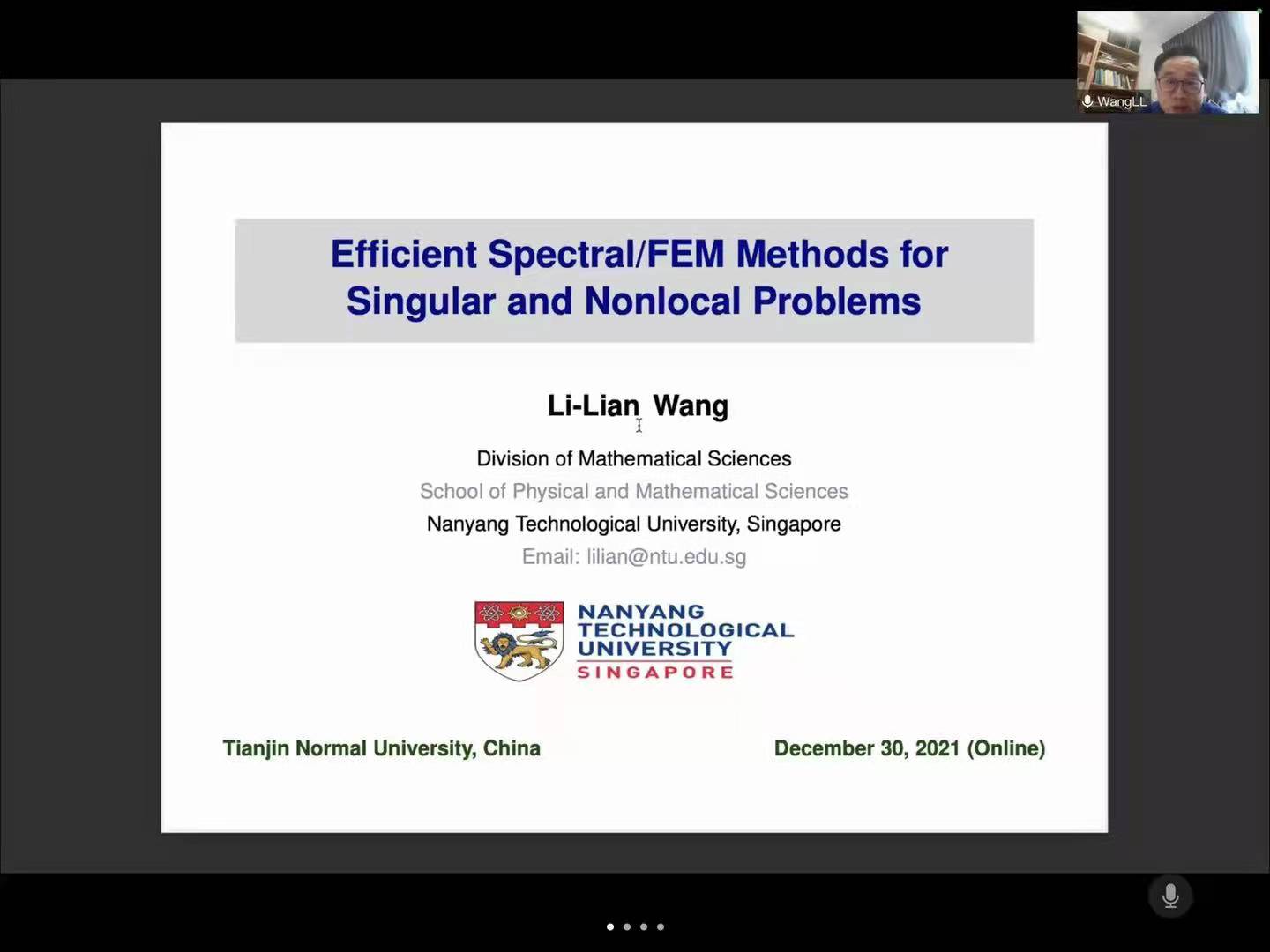 20211230日上午,数学科学学院邀请南洋理工大学王立联教授为交叉学科论坛带来以《奇异和非局部问题的高效谱方法》为题的线上学术报告。数学科学学院常慧宾副院长主持报告,我院计算数学创新团队等学院教师、研究生及本科生共同聆听报告,也吸引了美国迈阿密大学阮士贵教授等多名校外专家以及学生的参与。