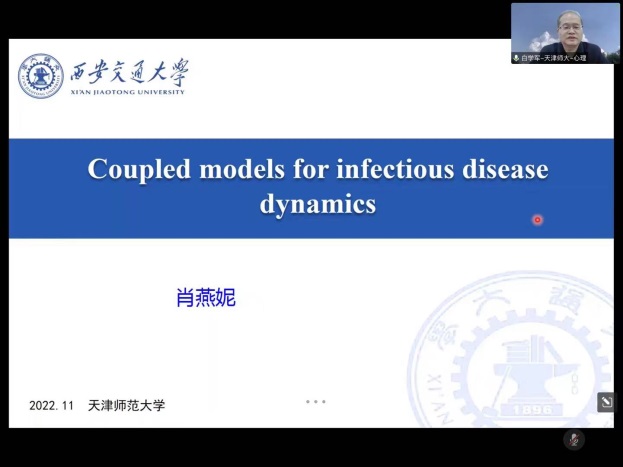 2022年11月15日上午9时,数学科学学院邀请西安交通大学肖燕妮教授为交叉学科论坛带来题为《传染病动力学的耦合模型》的线上学术报告。我校白学军副校长和常慧宾副院长主持报告,我院赵春院长等多名教师、研究生及本科生共同聆听报告,同时报告也吸引了多名外校专家以及学生参与。