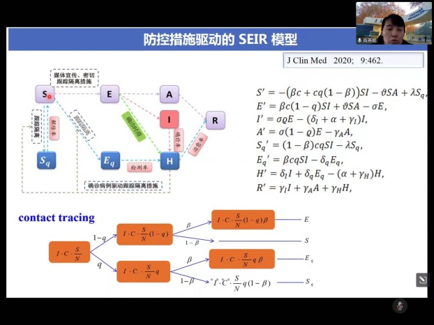 在疾病传播动力学建模中,在不同尺度上耦合模型变得具有挑战性。在本次报告中,肖教授简要介绍了人口和个人层面的建模方法。通过将传播率和疾病导致的死亡率与感染个体内的病毒载量联系起来,将宿主内动态嵌套到宿主间开发一个多尺度模型。并对最近ky开云手机版新冠肺炎感染的研究,包括一个基于随机个体的四层复杂网络模型,以解释为什么儿童在新冠肺炎疫情的四次流行浪潮中扮演不同的角色进行介绍。同时,为了避免疫情爆发,设计了网络模型来检验可行的移动策略。最后,对多尺度建模方法进行总结。报告最后,肖教授在线与师生进行了友好互动,对师生提出的问题进行解答。