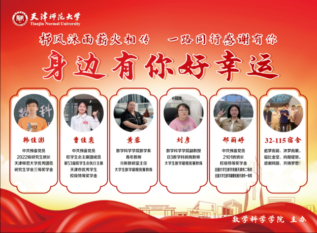 开学典礼结束后,学院举行“身边有你好幸运”表彰会。数学科学学院黄蓉老师、刘彦老师、2022级研究生韩佳澎、2021级本科生曹佳奕和邢丽婷、35号楼115宿舍分别受到表彰。