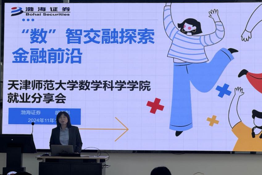 11月1日下午,学院在博B115开展“数”智交融探索金融前沿”就业分享会,邀请渤海证券水上公园东路营业部总经理胡天彤作为主讲人。会议伊始,胡经理对渤海证券公司和证券市场做了详细的介绍。她结合数据调研报告,分析了当前就业市场情况。同时,她讲述风险管理中的数学方法,金融衍生品定价模型,高频交易中的数字算法,这些都说明了数学作为基础学科,与金融行业紧密结合。整个会议过程中,胡经理以亲切的语言和生动的案例,赢得了同学们的阵阵掌声。