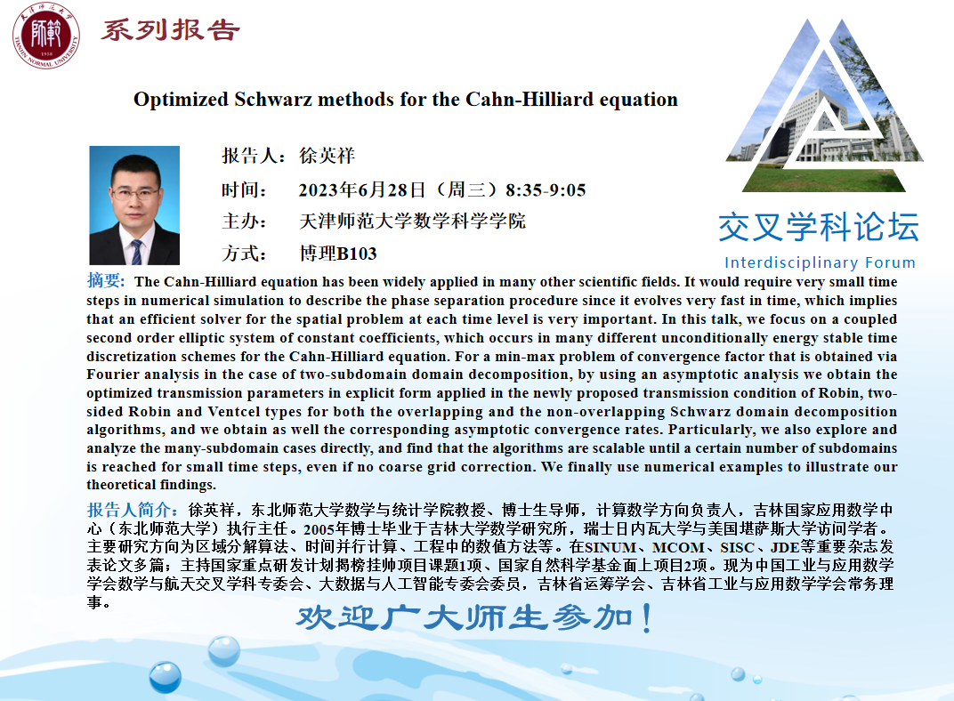 【预告】学术报告(2023-14)6月26日——Optimized Schwarz methods for the Cahn-Hilliard equation