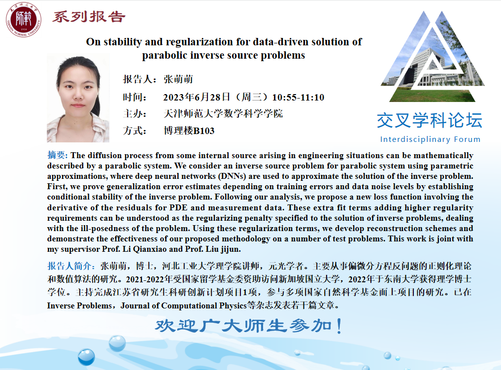 【预告】学术报告(2023-18)6月28日——On stability and regularization for data-driven solution of parabolic inverse source problems