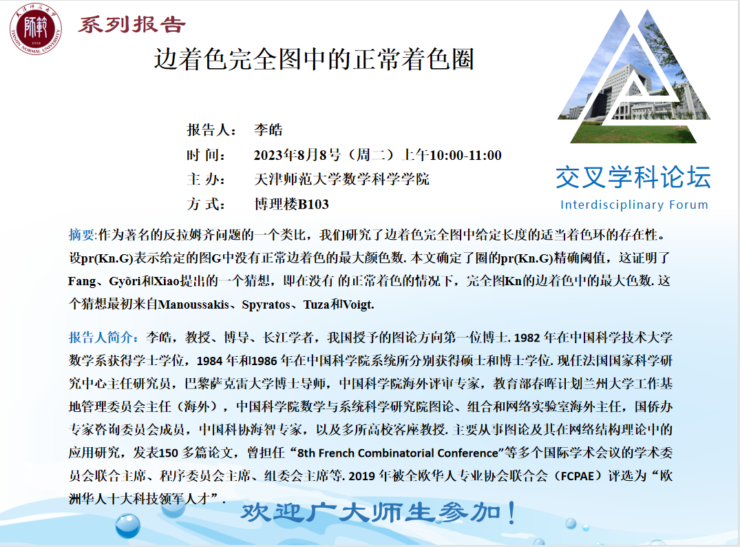 【预告】学术报告(2023-25)8月8日—边着色完全图中的正常着色圈