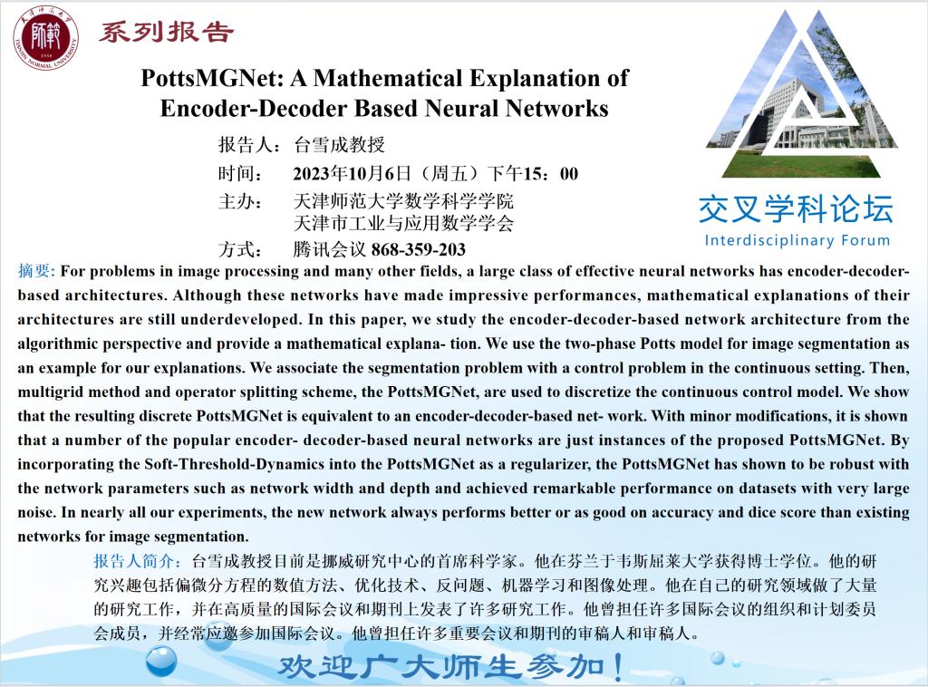 【预告】学术报告(2023-34)10月6日—PottsMGNet: A Mathematical Explanation of Encoder-Decoder Based Neural Networks