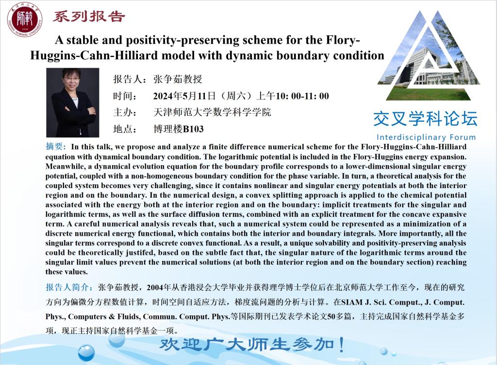 【预告】学术报告(2024-6)5月11日——A stable and positivity-preserving scheme for the Flory-Huggins-Cahn-Hilliard model with dynamic boundary condition