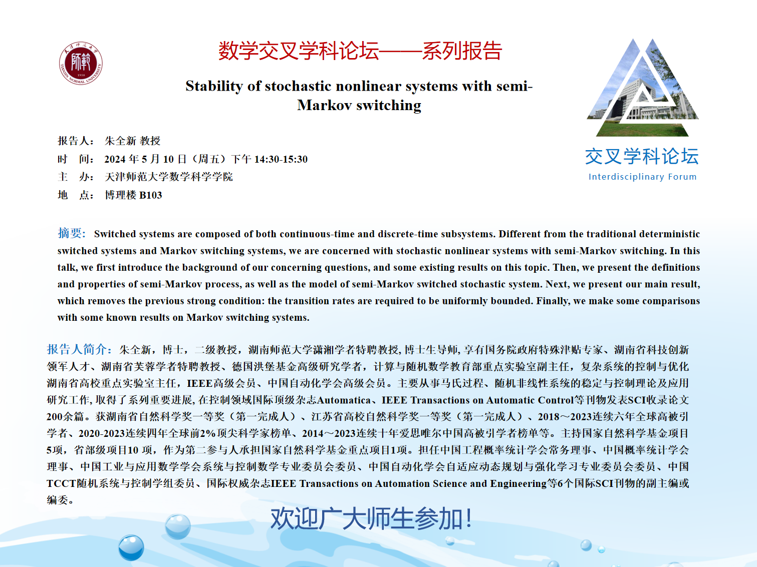 【预告】学术报告(2024-7)5月10日——Stability of stochastic nonlinear systems with semi-Markov switching