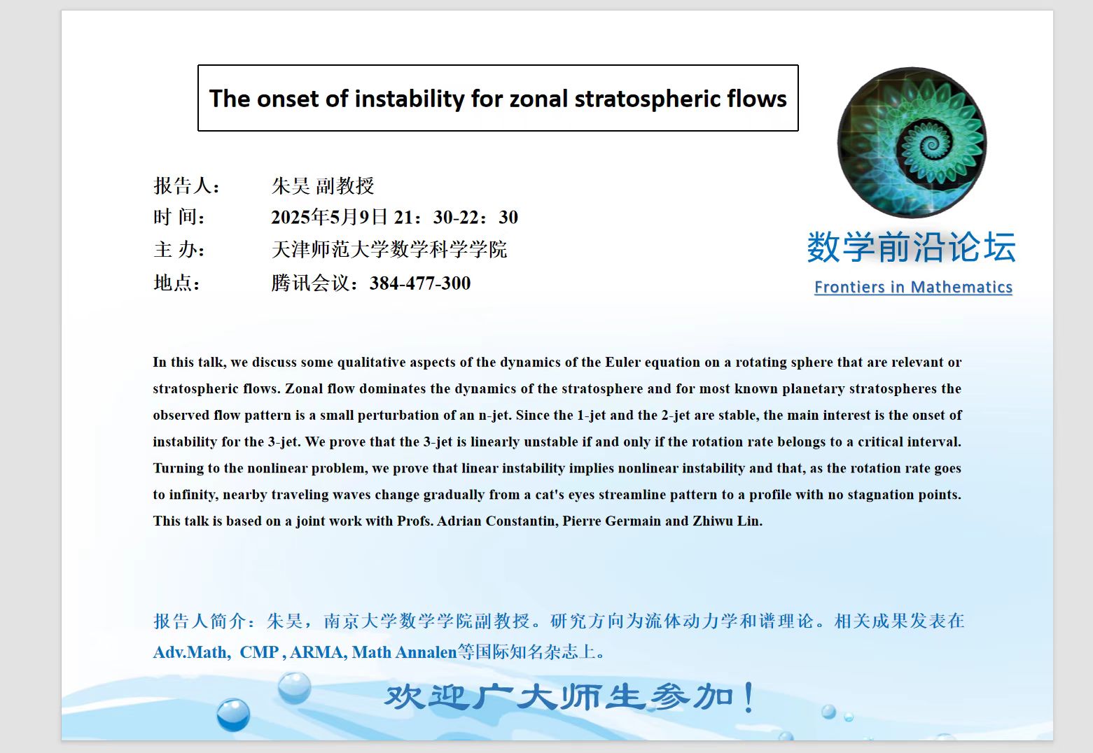 【预告】学术报告(2025-15)5月9日——The onset of instability for zonal stratospheric flows