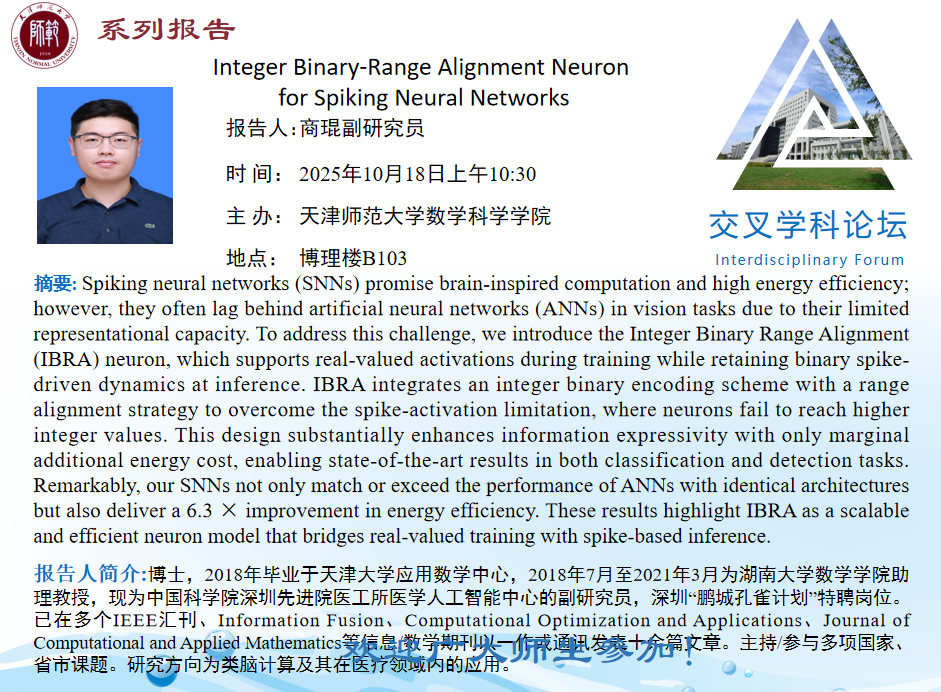 【预告】学术报告(2025-42)10月18日-Integer Binary-Range Alignment Neuronfor Spiking Neural Networks