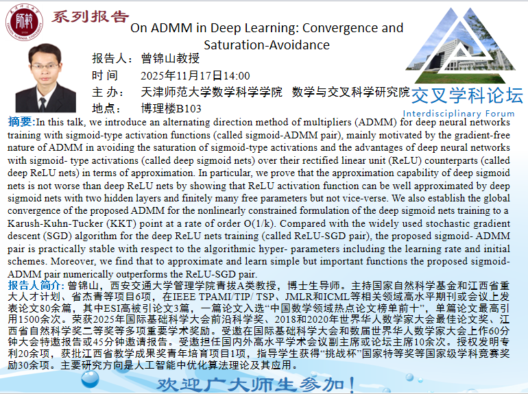 【预告】学术报告(2025-47)11月17日-On ADMM in Deep Learning:Convergence andSaturation-Avoidance