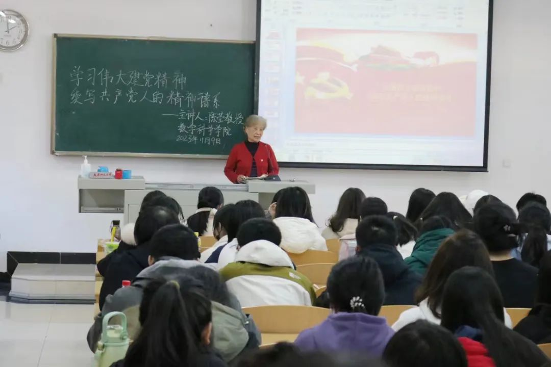 为全面学习贯彻党的二十大精神,加强理想信念教育,厚植家国情怀,近日,数学科学学院特邀校关工委副主任、报告团团长——陈莹教授作题为《弘扬伟大建党精神,续写共产党人的精神谱系》专题讲座。