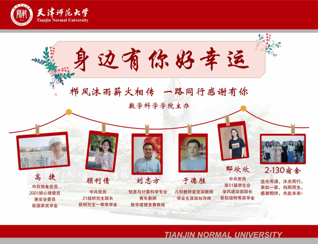 数学科学学院于德胜老师,刘志方老师,21级研究生顾利倩,2020级本科生高捷,2020级本科生邸欣欣和2号楼130宿舍分别受到表彰。