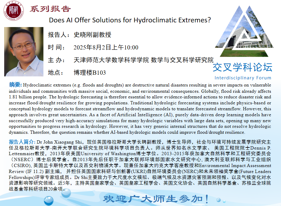 【预告】学术报告(2025-13)8月2日--Does AI Offer Solutions for Hydroclimatic Extremes?