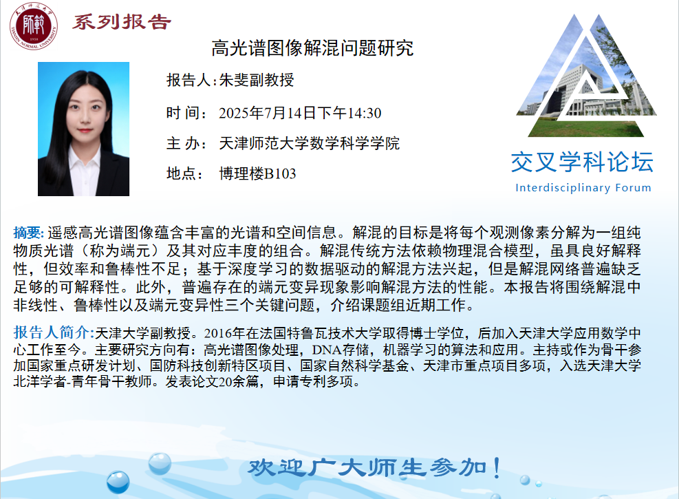 【预告】学术报告(2025-11)7月14日--高光谱图像解混问题研究